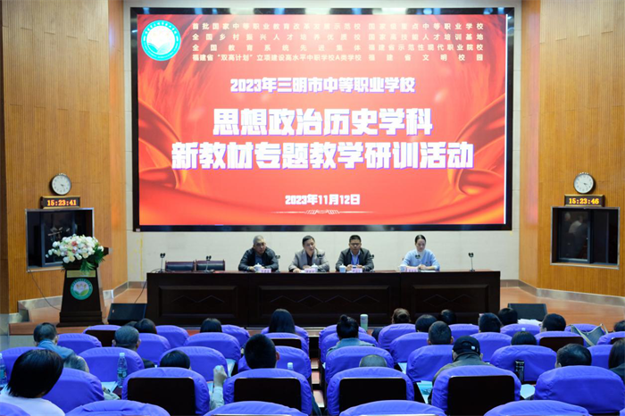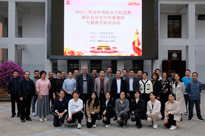 为贯彻落实2023年国家级示范培训和省级培训精神,切实做好中职思想政治和历史学科统编教材使用工作,进一步强化中职思政课和历史课的政治引导功能,推动中职思政和历史学科的教学改革。2023 年11月12—14日,三明市中等职业学校思政和历史学科新教材专题教学研训活动在我校举办,来自全市各中职学校思政和历史学科30余人参与活动。