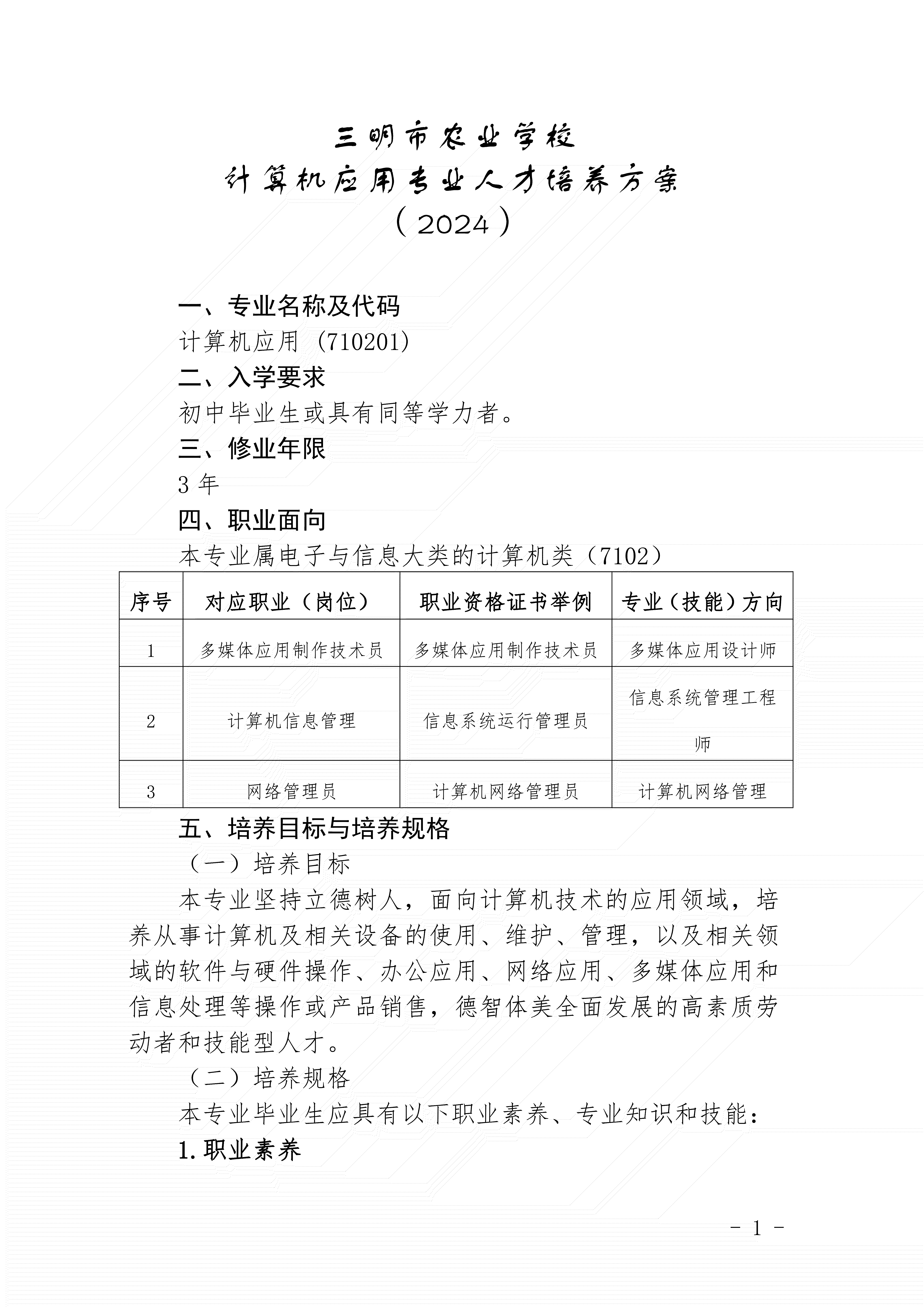 三明市农业学校计算机应用专业人才培养方案(2024)